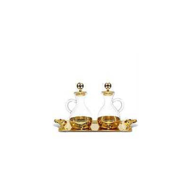 Cruet Set in golden brass.Tray has handles with red stones and two practical bases that keep jugs stable during travel. Capacity: 140 ml. Plate: 20,5x11 cm